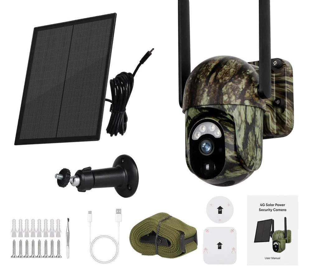 I paketet ingår kameran med solpanel, SIM-kort, monteringsrem, fästmallar och engelsk manual – komplettera gärna med vårt videoguide för installation. Minneskort upp till 128 GB stöds (medföljer ej).