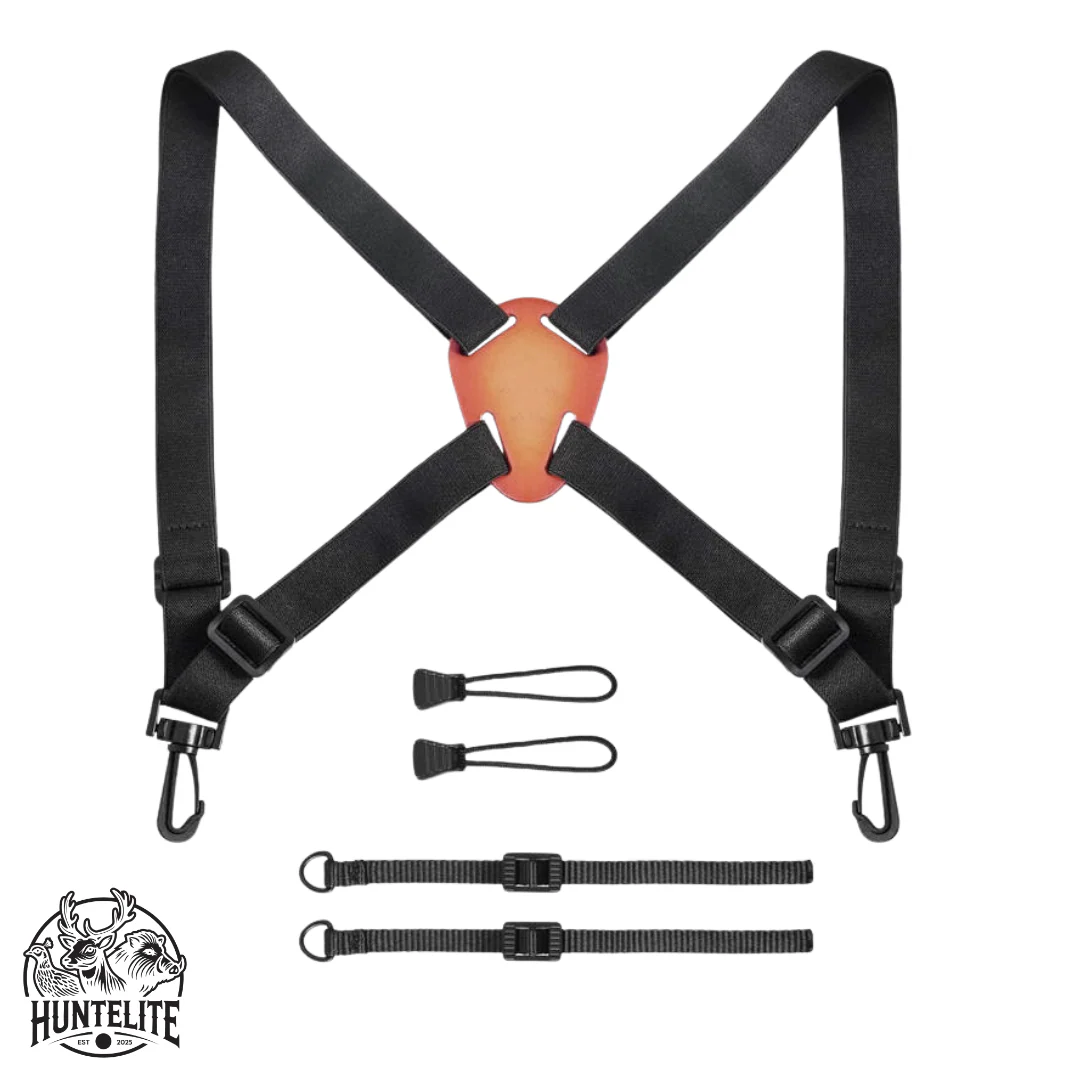 Bär din kikare både säkert och bekvämt med denna praktiska sele från HuntElite. Den smarta utformningen fördelar vikten jämnt över axlarna, vilket minskar kikarsvängningar och förebygger trötthet i nacken under långa dagar ute i terrängen.